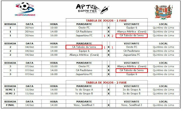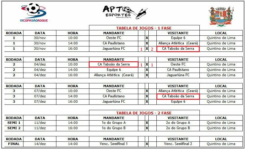 Edição da Copa São Roque de Futebol Sub- 20, o time já disputou 2 rodadas e segue invicto na competição; na 5ª feira, (30), bateu a equipe do Jaguriúna F. C. por 2 gol a 1 e nesta 2ª feira, (4), jogou e empatou coma forte equipe do Oeste F. C. de Itápolis, depois de estar perdendo por 1 gol, conseguiu a igualdade no segundo tempo: final do jogo: C. A. Taboão da Serra 1 x 1 Oeste F. C.