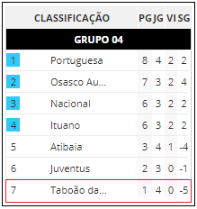 Encerrada a quarta rodada do primeiro turno da primeira fase da Copa Paulista de Futebol 2018 e, com essa derrota, o Cão pastor continua na lanterna do Grupo 4 com 1 ponto ganho. A Portuguesa de Desportos lidera com 8 pontos. Veja ao lado a nova tabela de classificação do Grupo 4: