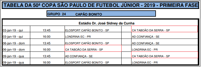 Os confrontos válidos pelo grupo 24, já estão definidos, a Federação Paulista de Futebol divulgou a tabela, em que os clubes se enfrentam em turno único, todos contra todos, avançando para a fase seguinte os dois mais bem colocados. Veja a tabela completa do Grupo 24: