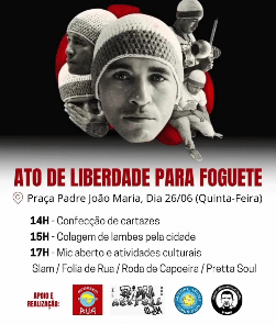 Com isso, movimentos e organizações sociais somadas ao comitê @euapoiofoguete convidam a todos um ato exigindo a liberdade deste pai e trabalhador. Acontece nessa quinta-feira (26), na Praça João Maria, Cidade Alta, Natal (RN) às 14h. Vai ter confecção de cartazes, colagem de lambes, roda de capoeira, batalha de slam e outras intervenções artísticas. Participe e lute junto com a quebrada por justiça social para Hallison e tantos outros, criminalizados por serem quem são.