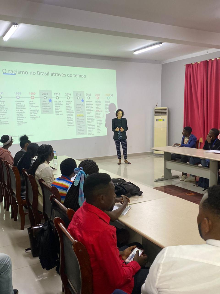 Uma das ações que tive no seminário foi apresentar uma oficina que mostrava uma linha do tempo do racismo no Brasil e propunha uma discussão entre os angolanos para construirmos uma análise da situação no país. Eles participaram muito e trouxeram exemplos de como a cor da pele mais clara implica em privilégios, mesmo quando 99% da população é retinta.