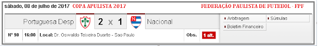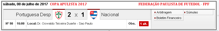 Na tarde deste domingo, (20), o Estádio Dr. Osvaldo Teixeira Duarte, o Canindé, foi o palco para o jogo válido pela 9ª rodada, (a 2ª do 2º turno), Copa Paulista de futebol de 2017, que reuniu as equipes da Associação Portuguesa de Desportos, (a Lusa) e do Nacional A. C. (o Naça).
