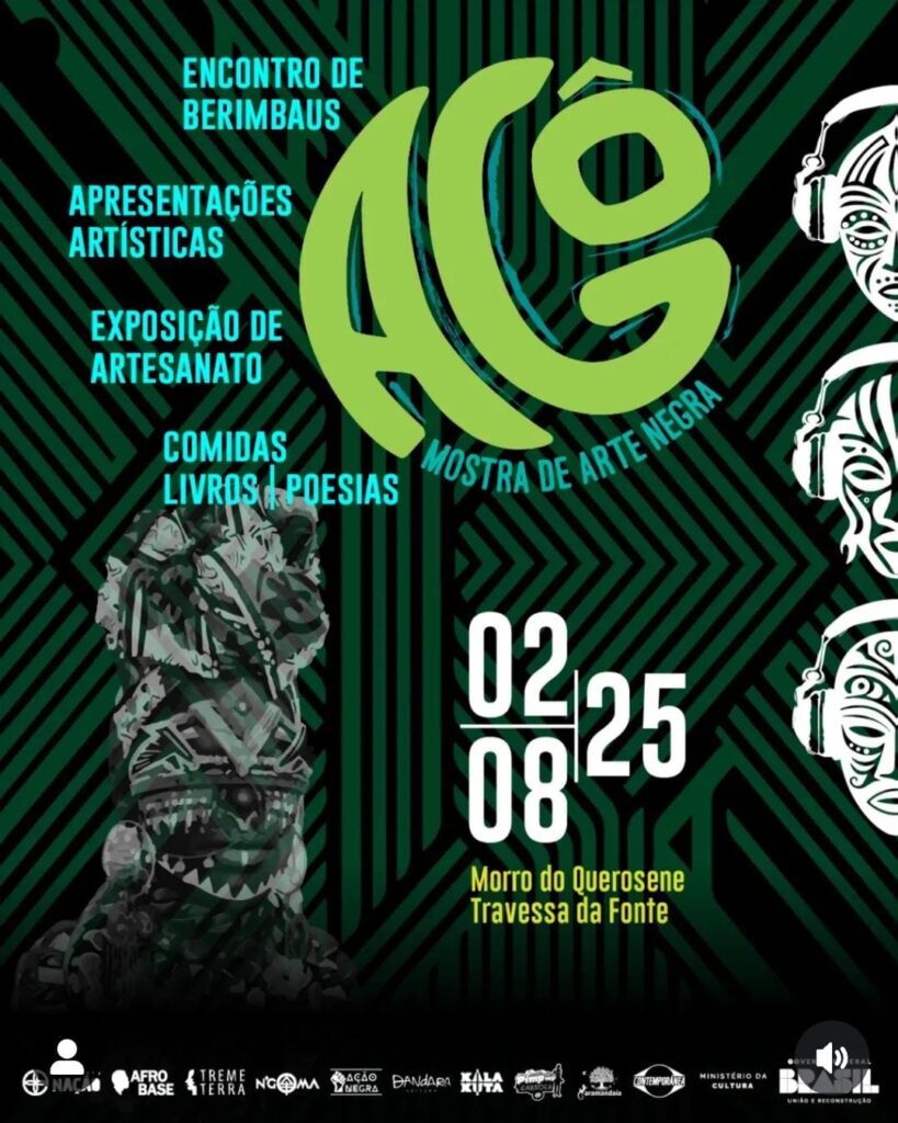 Conhecido por suas festas populares e manifestações culturais que ocupam as ruas, o Morro do Querosene se transforma, mais uma vez, em território de arte, memória e resistência. A programação tem início às 10h, com um ritual de abertura ao som dos berimbaus — uma performance coletiva conduzida pelo mestre Dinho Nascimento, da Orquestra de Berimbaus do Morro do Querosene, que reúne cerca de cem tocadores, entre mestres e mestras da capoeira, artistas e convidados. A concentração acontece na Praça do Morro do Querosene, de onde o cortejo segue até a Travessa da Fonte, em frente ao Parque da Fonte do Peabirú, local que abrigará os dois palcos principais do evento.