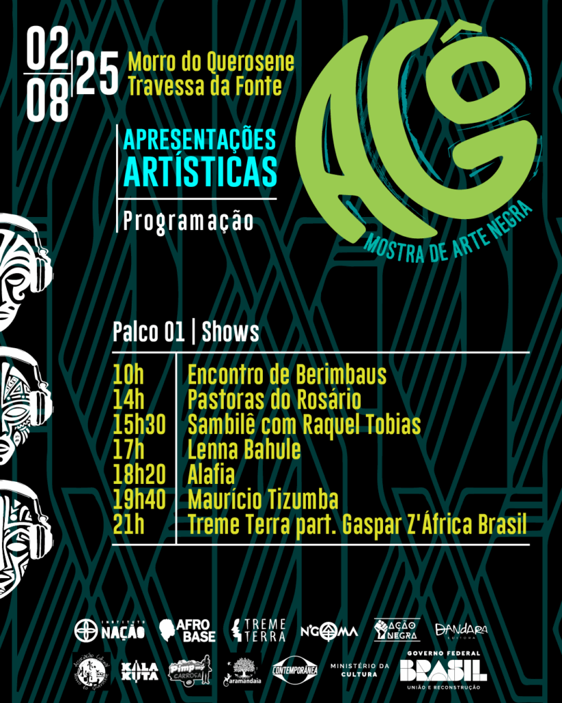 Ao longo do dia, o festival apresenta uma programação diversa e pulsante, celebrando a poesia da cultura negra. No Palco Principal, sobem artistas como Escola do Samba com Raquel Tobias, Pastoras do Rosário, Aláfia, Maurício Tizumba, Lenna Bahule e o Treme Terra, grupo nascido em 2006 no Morro, que encerra a noite com uma performance cênico-musical.