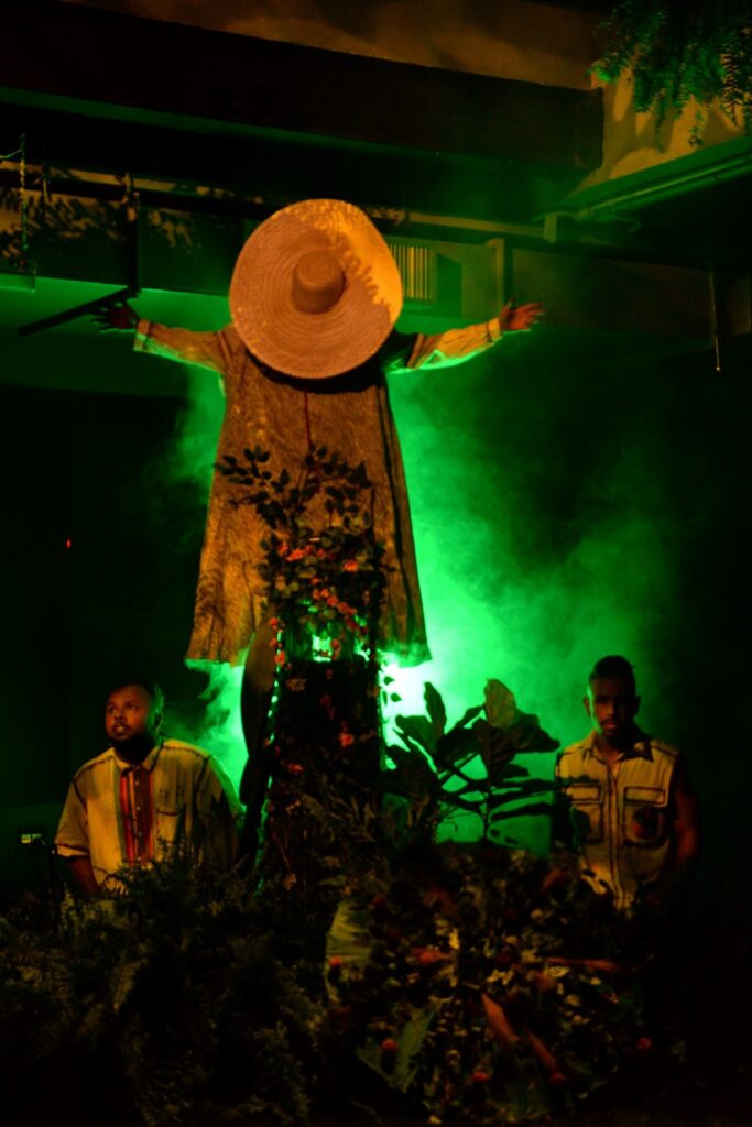 Na cenografia, concebida em parceria com Christopher Silva, Djalma Moura constrói uma ponte entre dança e artes plásticas, criando um espaço ritual onde a presença dos corpos e suas histórias se torna paisagem viva.