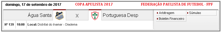 Na última rodada do 2º turno, a 14ª da Copa Paulistas de Futebol 2017, neste domingo, (17), às 10:00 h, a Lusa visita a equipe do E. C. Água Santa, no Estádio Distrital do Jardim Inamar, na cidade de Diadema, e o objetivo da equipe do Canindé é vencer o adversário e assim não depender de outros resultados para ser a primeira do Grupo