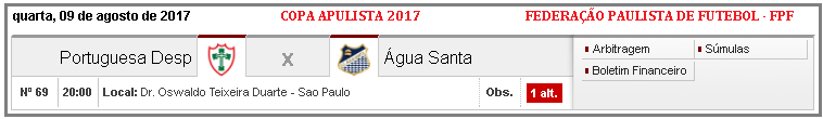 Na próxima 4ª feira, (9), no Estádio Osvaldo Teixeira de Oliveira, o Canindé, acontece a 7ª rodada do 1º turno da 1ª fase, do Grupo 3 da Copa Paulista 2017, que porá frente a frente, o líder diante do vice-líder do Grupo: Associação Portuguesa de Desportos e E. C. Água Santa; ambos separados por 1 ponto na tabela.