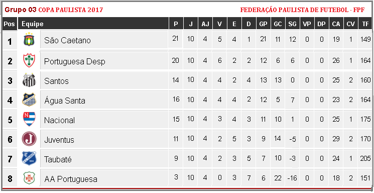 Encerrada a 10ª rodada, (a 3ª do 2º turno da 1ª fase), da Copa Paulista de futebol 2017 e com a vitória da Lusa   diante do Juventus, e com o triunfo do São Caetano, a Portuguesa segue a um ponto do líder da  da tabela, com 20 pontos; veja abaixo a nova classificação: