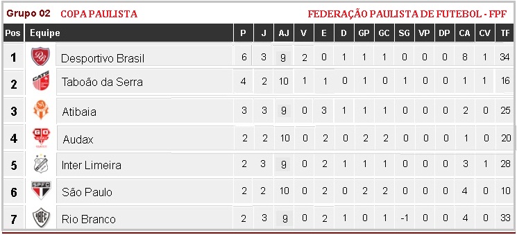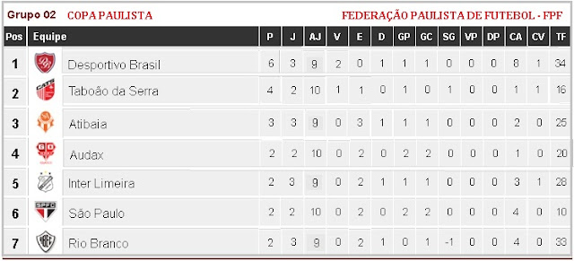 Depois dos resultados da 4ª rodada do 1º turno da 1ª fase da Copa Paulista edição de 2017, (vale lembrar que a partida entre o São Paulo F. C. e o Desportivo Brasil P. L.foi adiada desta 4ª (19), para a 2ª feira (25), com a 1ª derrota do Cão Pastor, a equipe serrana caiu da vice-liderança da chave para a 4ª posição com 4 pontos, enquanto a Inter com sua primeira vitória na competição subiu para o 3º posto, com 5 pontos ganhos; veja a tabela atualizada do Grupo 2 da Copa Paulista 2017:
